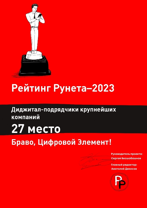 Год от года компания «Цифровой Элемент» оказывается в топе лидеров отрасли, а это значит, что мы повышаем уровень качества услуг, развиваем технологии разработки и можем конкурировать с крупными компаниями по всей России.