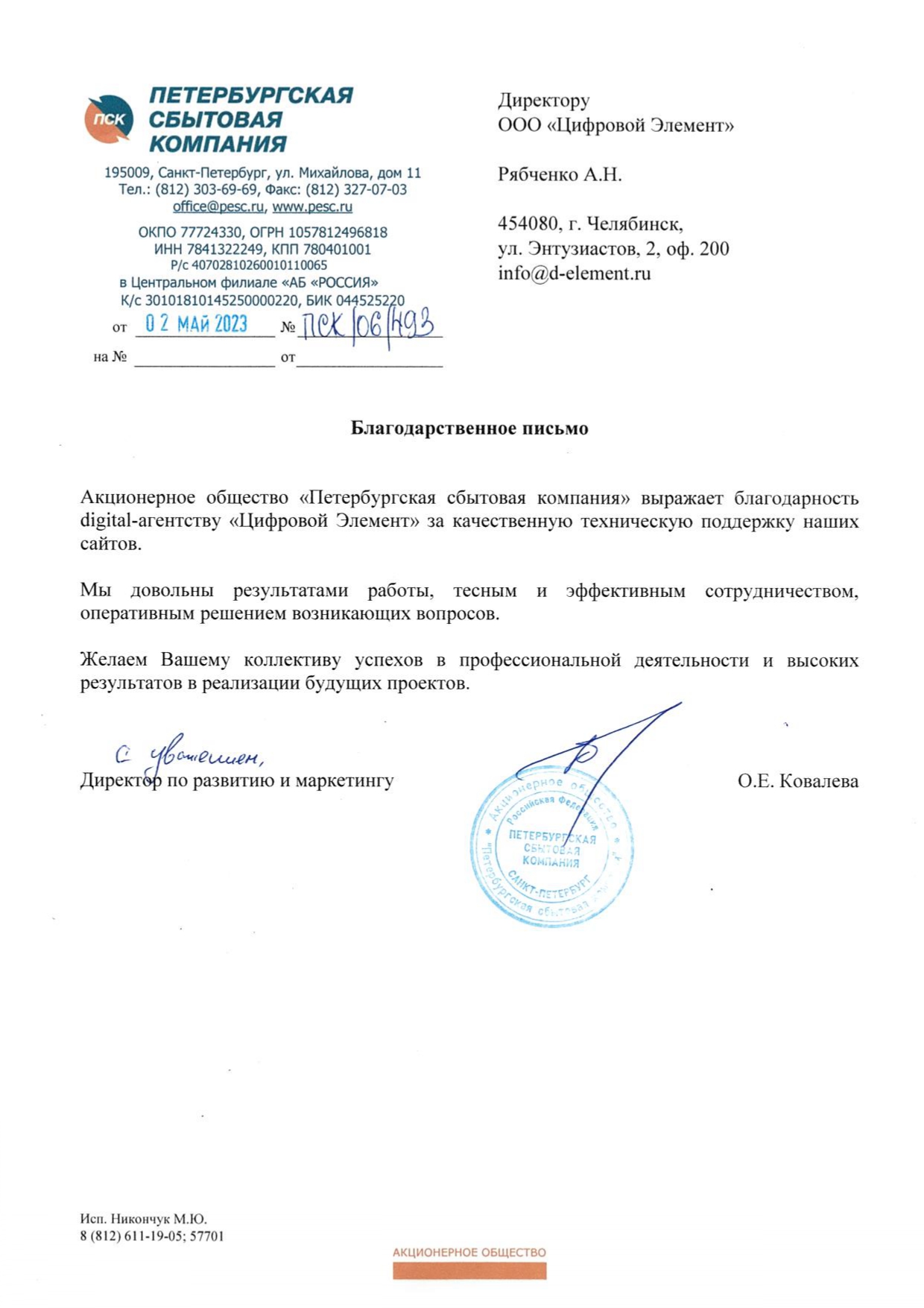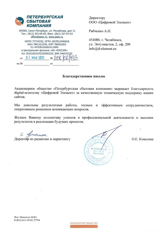 АО «ПСК» выражает благодарность digital-агентству «Цифровой Элемент» за качественную техническую поддержку наших сайтов.