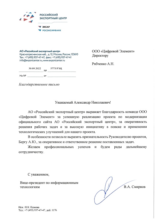 АО «Российский экспортный центр» выражает благодарность команде ООО «Цифровой Элемент» за успешную реализацию проекта по модернизации официального сайта АО «Российский экспортный центр», за оперативность решения рабочих задач и за высокую инициативу в поиске и применении технологических улучшений для нашего проекта.