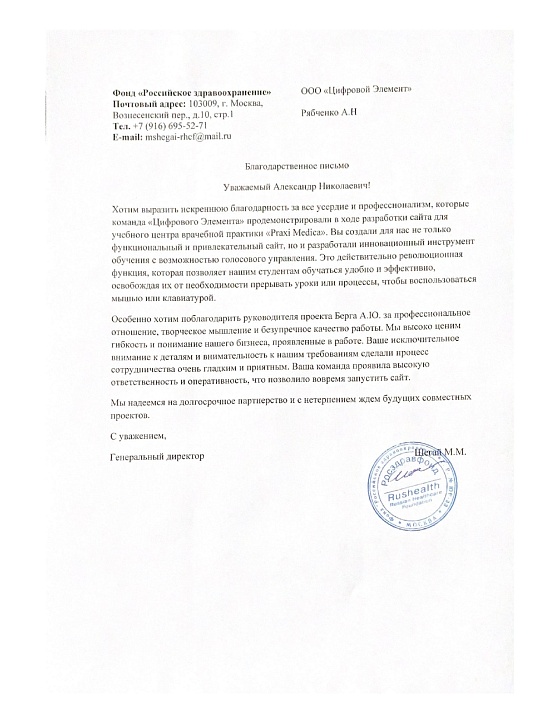 Хотим выразить искреннюю благодарность за все усердие и профессионализм, которые команда «Цифрового Элемента» продемонстрировали в ходе разработки сайта для учебного центра врачебной практики «Praxi Medica». Вы создали для нас не только функциональный и привлекательный сайт, но и разработали инновационный инструмент обучения с возможностью голосового управления.