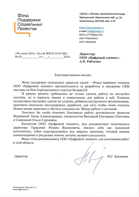 Фонд поддержки социальных проектов (далее - Фонд) выражает команде ООО «Цифровой элемент» признательность за разработку и внедрение CRM системы на базе Корпоративного портала Битрикс24.