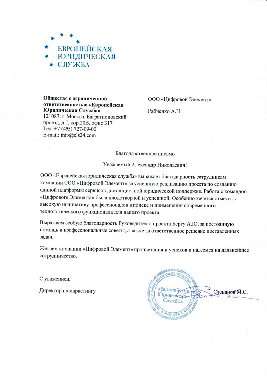 ООО «Европейская юридическая служба» выражает благодарость сотрудникам компании ООО «Цифровой Элемент» за успешную реализацию проекта по созданию единой платформы сервисов дистанционной юридической поддержки. Особенно хочется отметить высокую инициативу профессионалов в поиске и применении современного технологического функционала для нашего проекта.