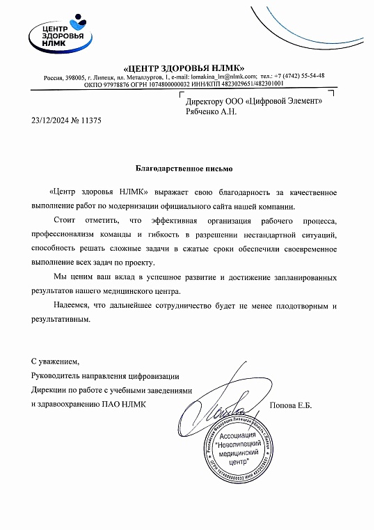 «Центр здоровья НЛМК» выражает свою благодарность за качественное выполнение работ по модернизации официального сайта нашей компании.