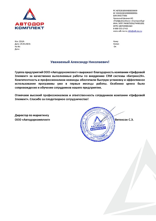 Группа предприятий ООО «Автодоркомплект» выражает благодарность компании «Цифровой Элемент» за качественно выполненные работы по внедрению CRM системы «Битрикс24». Компетентность и профессионализм команды обеспечили быструю установку и эффективное использование программы уже в первые месяцы работы. Особенно ценно было сопровождение и обучение сотрудников нашего предприятия. Отмечаем высокий профессионализм и ответственность сотрудников компании «Цифровой Элемент». Спасибо за плодотворное сотрудничество!
